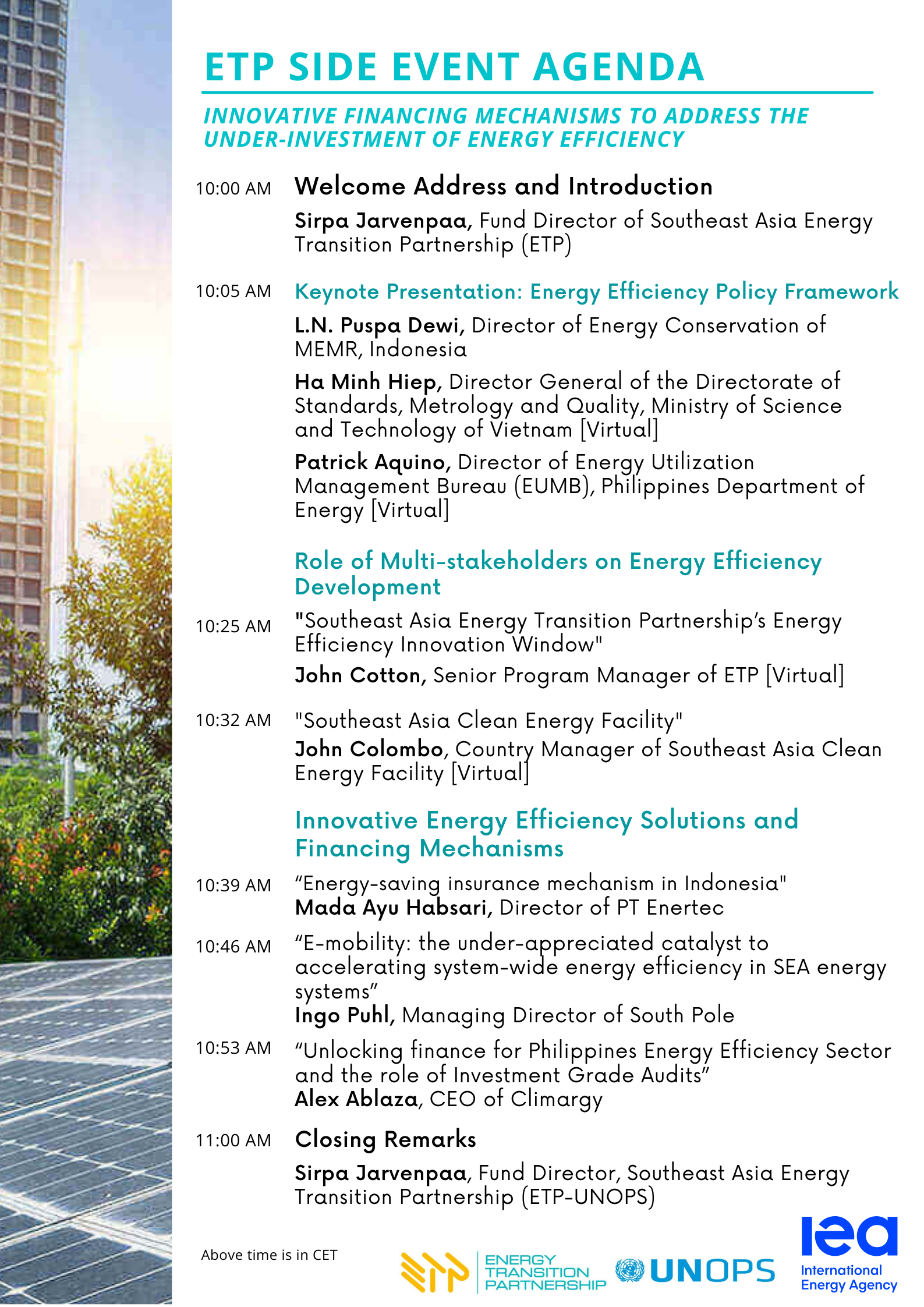 Energy Efficiency in Southeast Asia: Innovative Financing Mechanisms to Address the under-investment of Energy Efficiency Organised by the Southeast Asia Energy Transitions Partnership and UNOPS.